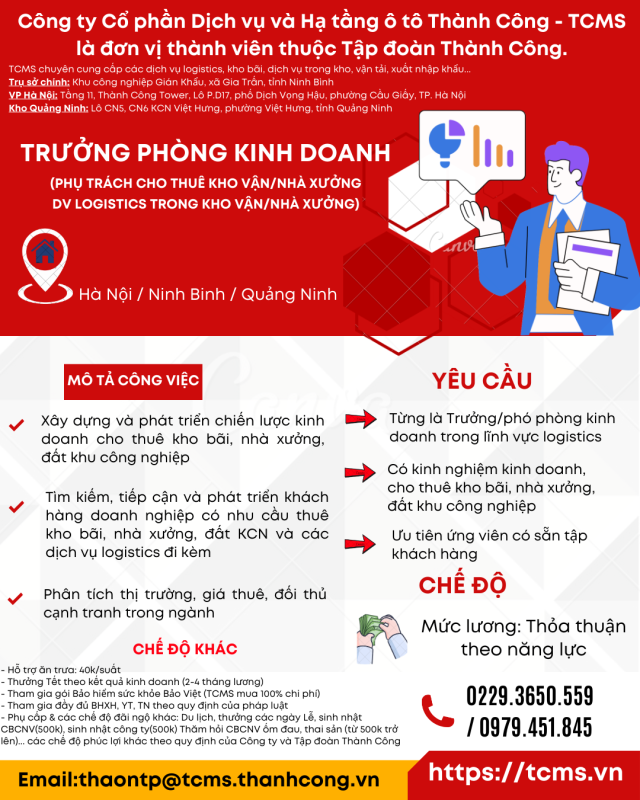 Ô TÔ THÀNH CÔNG: TUYỂN DỤNG TRƯỞNG PHÒNG KINH DOANH (PHỤ TRÁCH CHO THUÊ KHO VẬN/NHÀ XƯỞNG; DỊCH VỤ LOGISTICS TRONG KHO VẬN/NHÀ XƯỞNG)
